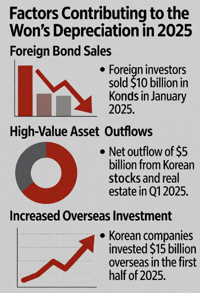 - 이유: 한국 부동산 가격 상승으로 금리 인하 기대가 줄고, 미국 금리 인하 지연으로 한미 금리 차가 벌어지면서 국채 매력이 떨어짐. 매도 자금이 환전되면서 원화 약세를 부추김.
