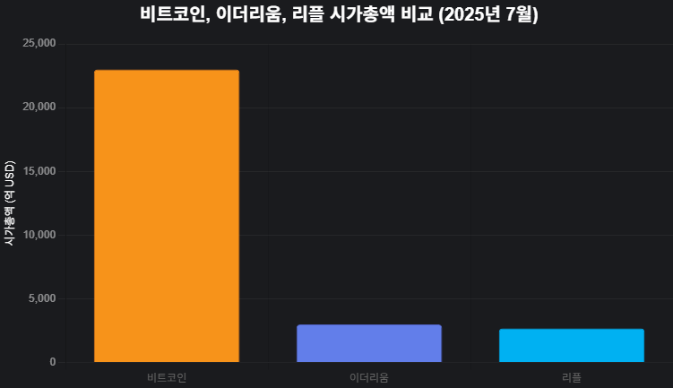 아래 차트는 2025년 7월 기준 비트코인, 이더리움, 리플의 시가총액을 비교합니다.